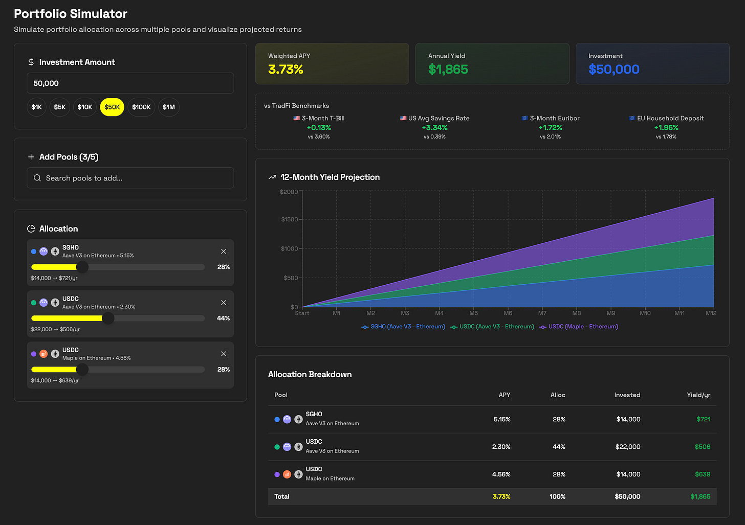 In the example below, a $50,000 allocation split across three pools: SGHO on Aave V3 at 5.15% (28%), USDC on Aave V3 at 2.30% (44%), and USDC on Maple at 4.56% (28%). The blended result is a weighted APY of 3.73% and $1,865 in projected annual yield. Every allocation is benchmarked in real time against four TradFi reference rates: the 3-month T-bill (3.60%), US Average Savings Rate (0.39%), 3-month Euribor (2.01%), and EU Household Deposit rate (1.78%). The 3.73% weighted APY clears all four benchmarks simultaneously.