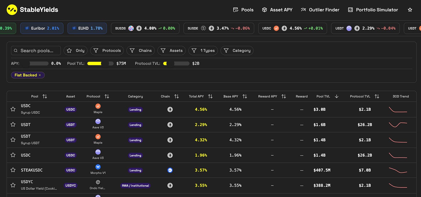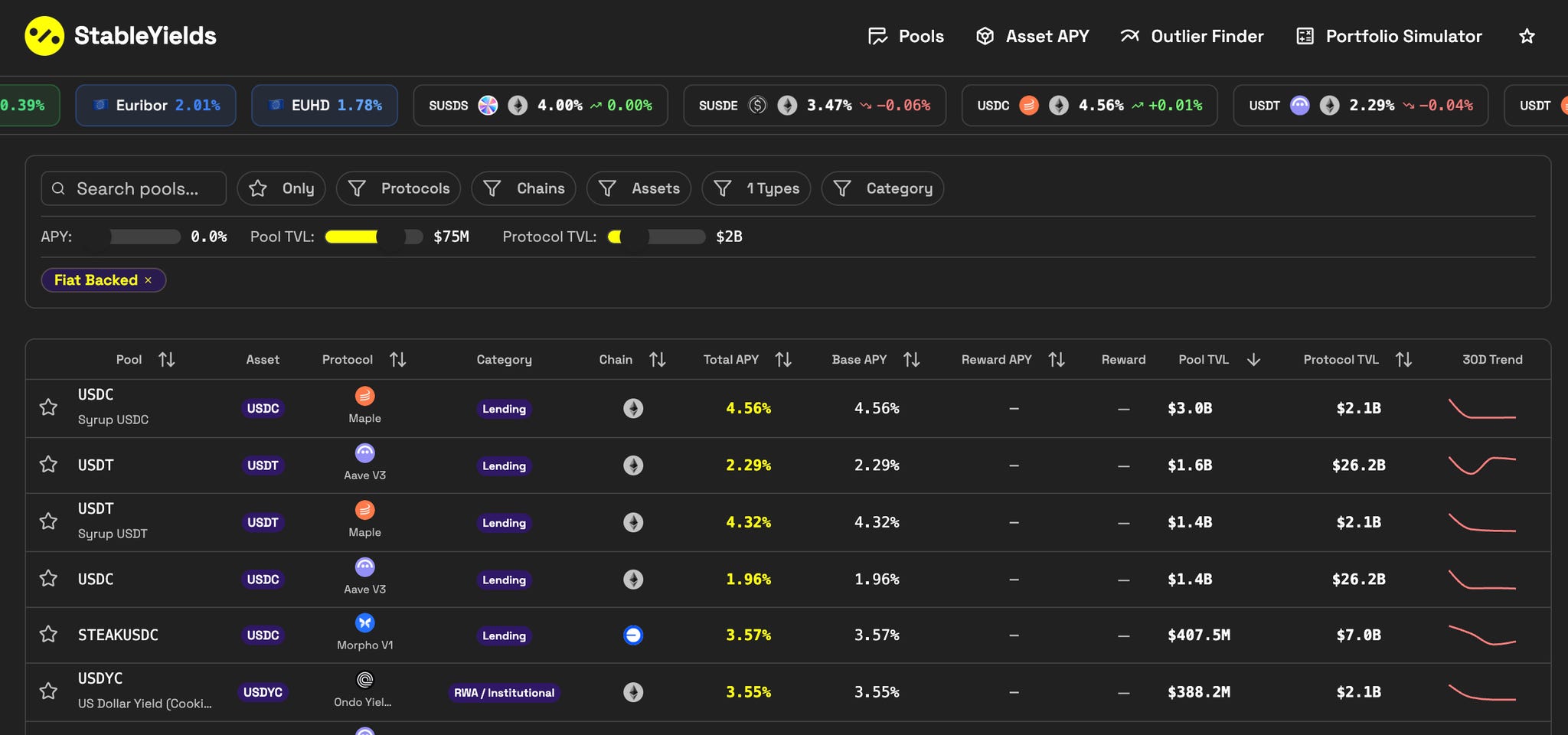 On StableYields, the filter is straightforward: fiat-backed stablecoins only, minimum pool size $75M, protocol TVL above $2B. Those three constraints eliminate noise and leave only deep, institutional-grade liquidity in assets with the simplest risk profile. The result: Maple’s Syrup USDC at 4.56% base APY sits at the top of the list, lending yield inside a protocol with $2.1B TVL. It clears the T-bill benchmark with a 26 basis point spread and zero reliance on incentives to hold the rate.