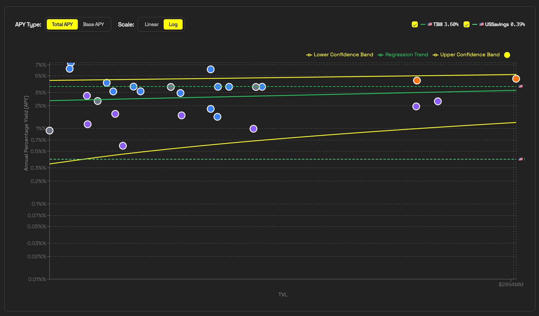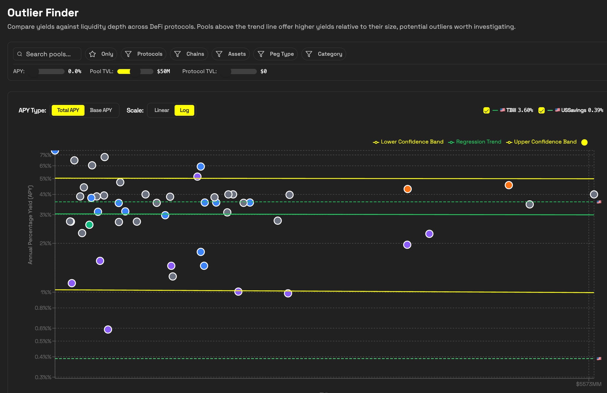For deeper analysis, the Outlier Finder maps every pool on an APY vs TVL regression, again with T-bill and US Savings as reference lines. Pools above the regression line are yielding more than their liquidity depth implies, structural outliers worth investigating.