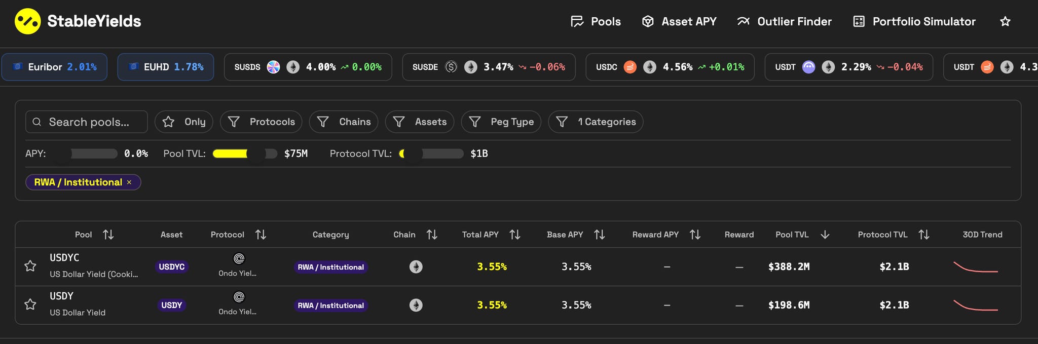 On the Pools tab, filtering by RWA / Institutional category surfaces exactly this universe. Ondo’s US Dollar Yield pools come in at 3.55% base APY with $388M and $198M in pool TVL on a $2.1B protocol, no reward emissions, no rate volatility from incentive cycles. For European allocators benchmarking against Euribor at 2.01%, that’s 154 basis points of structural spread in a regulated instrument.