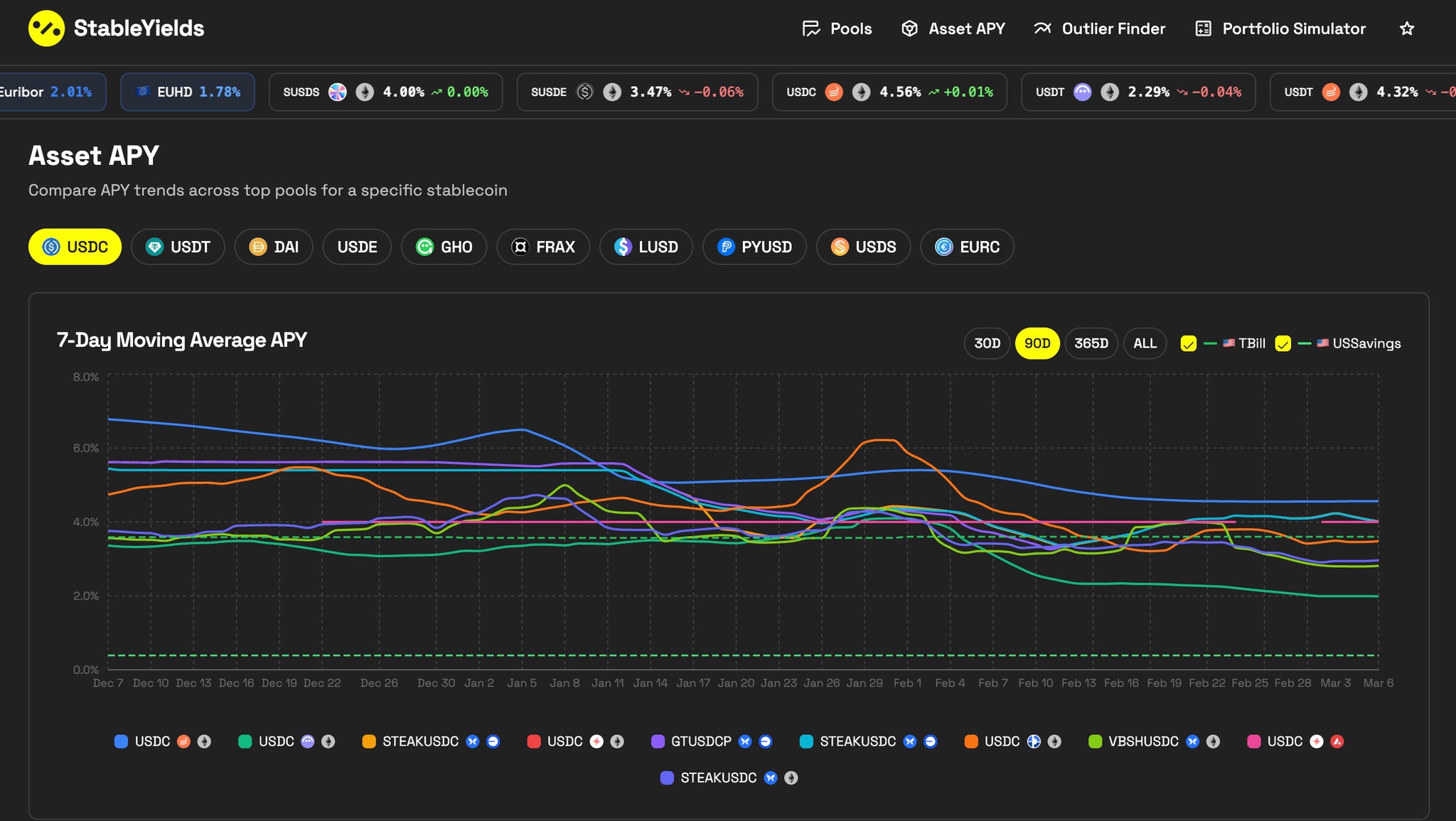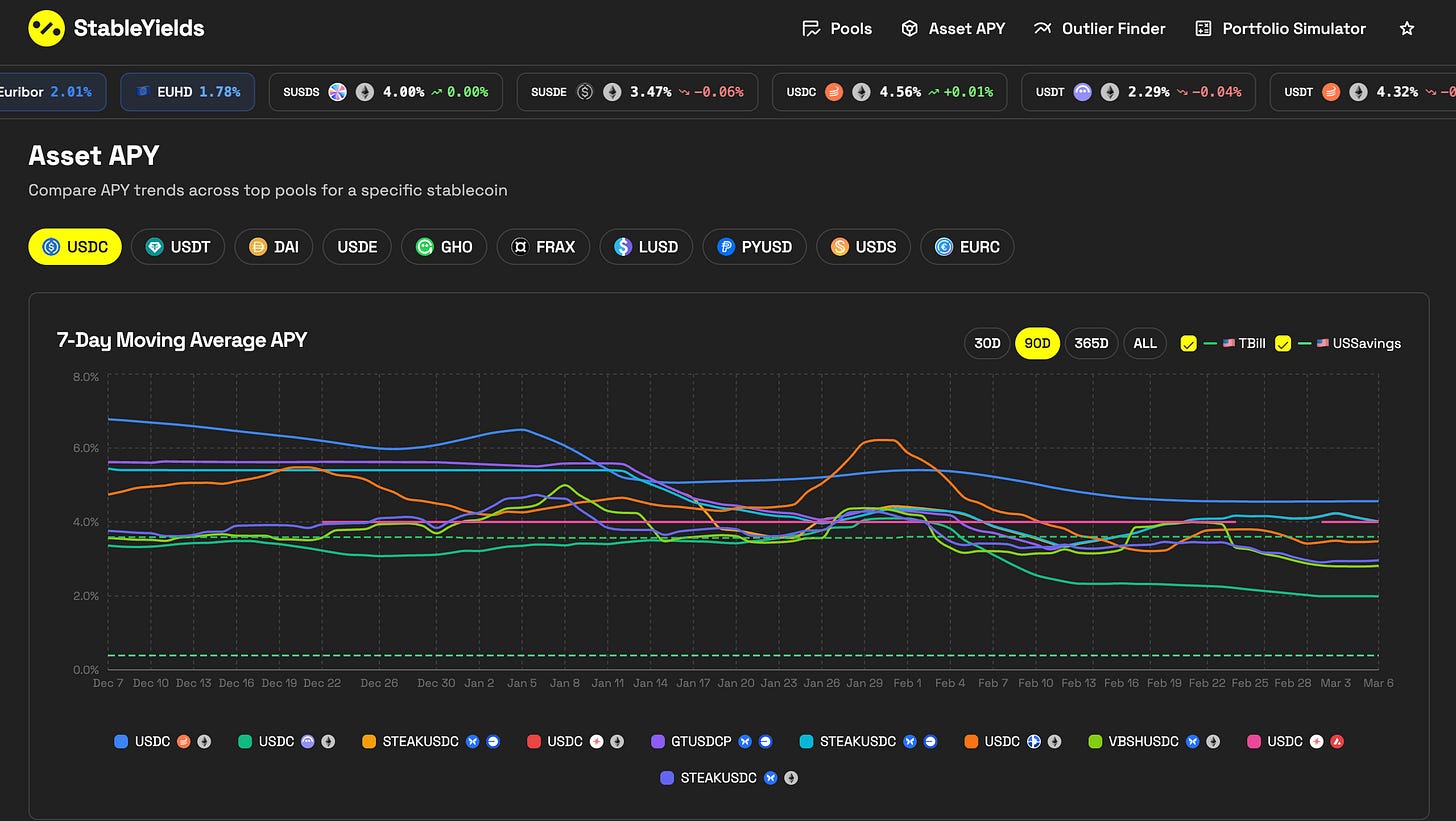 Stable Yields does not replace due diligence. It compresses the research. Pool filters by TVL, chain, and asset surface defensible rates fast. Asset APY shows the 30-day trend so you know if a rate is structural or a spike. Outlier Finder maps every pool against a TVL regression to flag yield above what liquidity depth implies. Portfolio Simulator turns any allocation into a dollar yield projection benchmarked against T-bill, Euribor, and US Savings in real time.